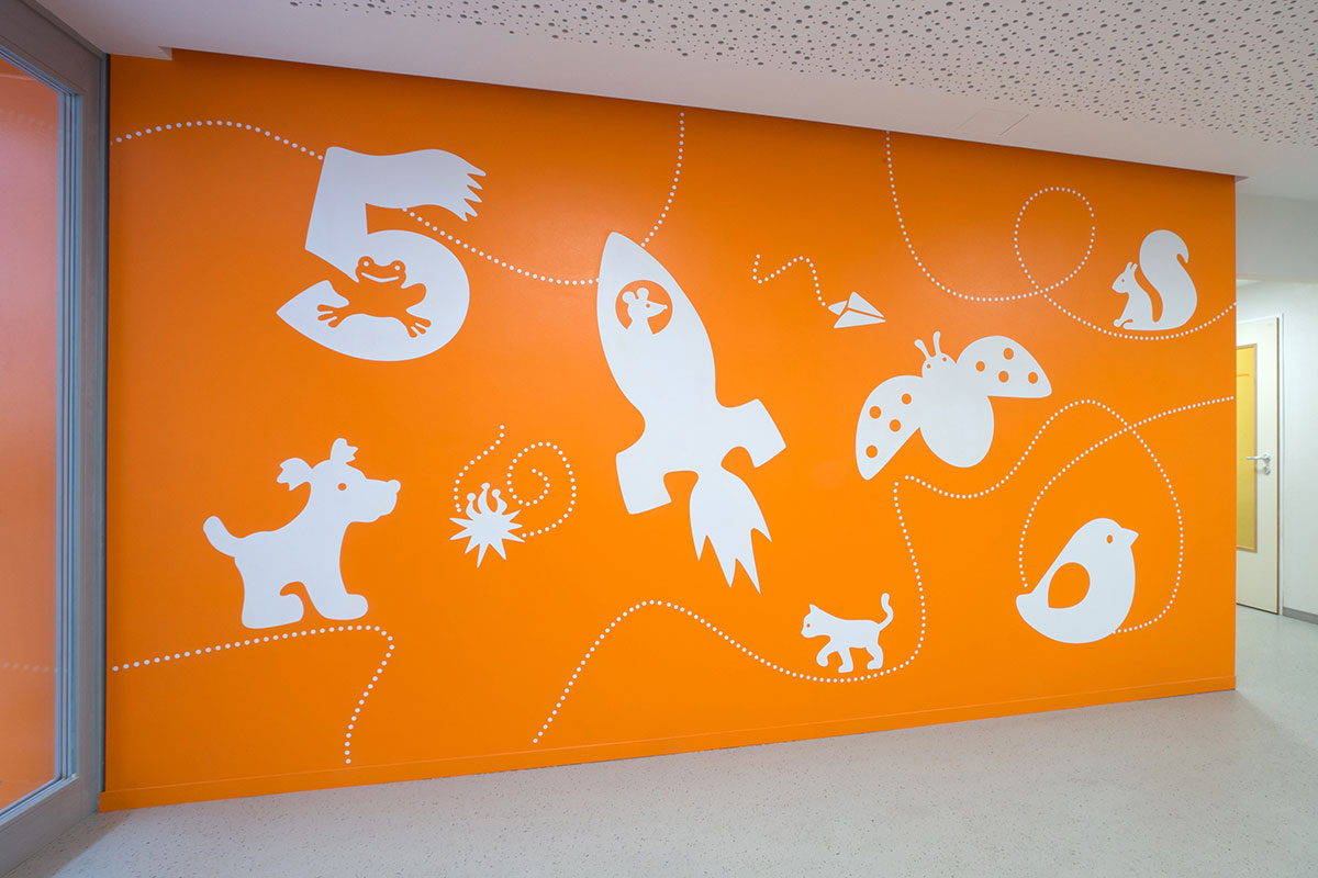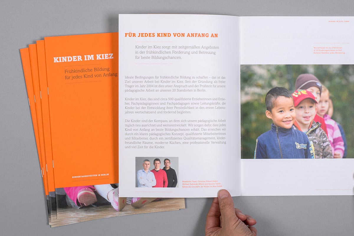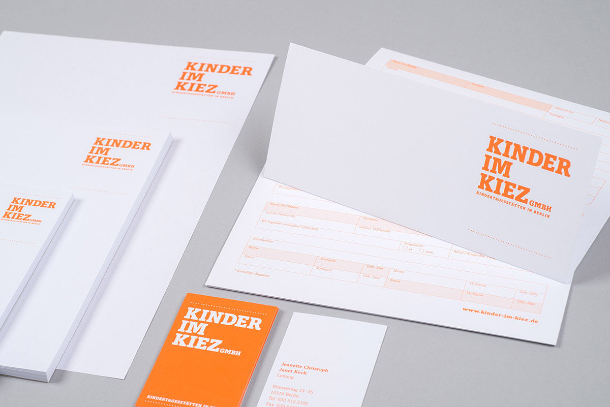 Das Corporate Design entstand mit Blick auf die Besonderheiten der einzelnen Einrichtungen. Jede Kita erhielt ein Sublogo, das sich leicht mit dem typografischen Logo der Gesellschaft kombinieren lässt. Neben den Sublogos entstand ein umfangreiches Piktogrammsystem, das in allen Medien des Trägers funktioniert. Als Ergänzung des von den Kitas entwickelten Raumkonzeptes wurde von uns ein Konzept zur Signalisierung der Häuser entwickelt und umgesetzt. Neben der Beschilderung der Gruppenräume erfolgte die Installation eines Informations- und Wegeleitsystems und einer Signalisation nach Außen. Die Marke »Kinder im Kiez« wird damit visuell direkt an den Standorten etabliert. Der positive Effekt ist unmittelbar erlebbar.